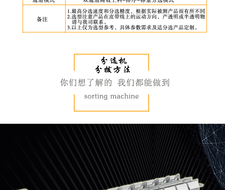 3、以上僅為選參考,具體參數(shù)需求及適合分選產(chǎn)品根據(jù)用戶實際需求定制